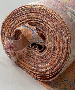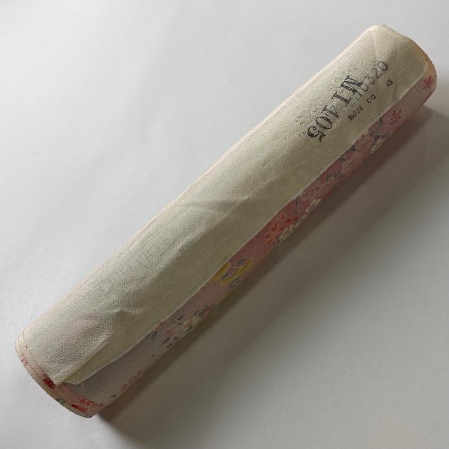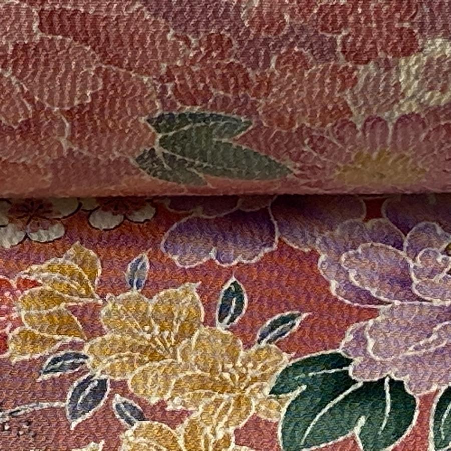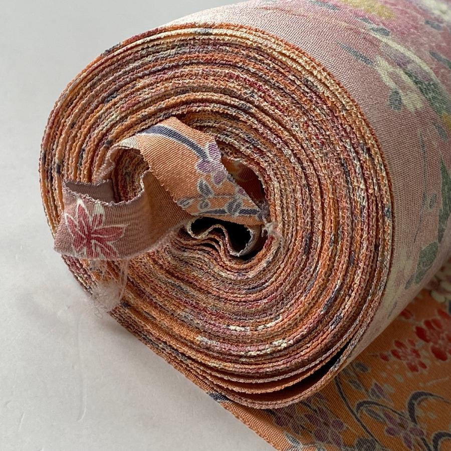 反物 秀品 小紋 四季花鳥図 金彩 サーモンピンク 正絹 中古