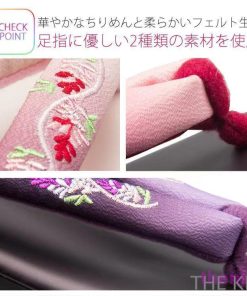 またさりげない刺繍や上品な色使いでどんな着物にも合わせやすく、紬や小紋などカジュアルなおしゃれ着は勿論、訪問着、色無地、卒業式のはかま姿、踊りや茶道などのお稽古履きなど、様々な和装姿に合う使い勝手のよいデザインとなっております。