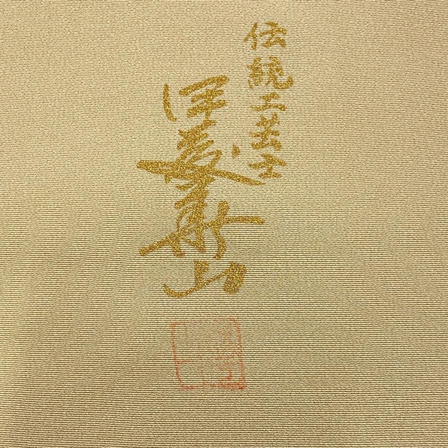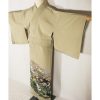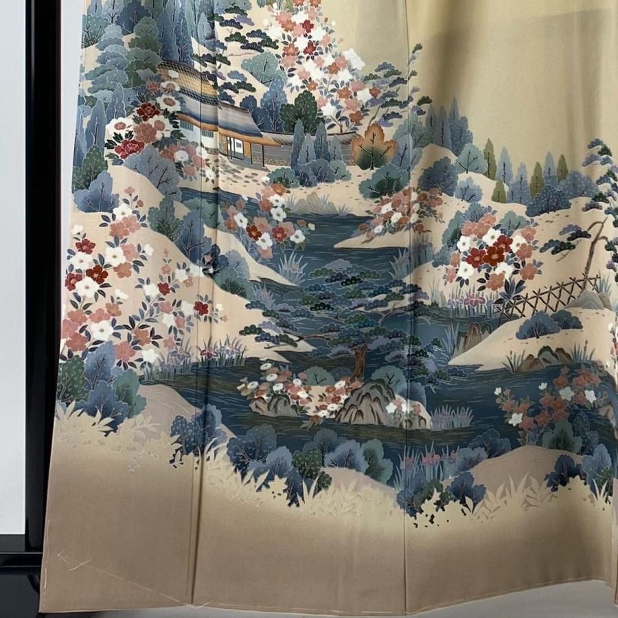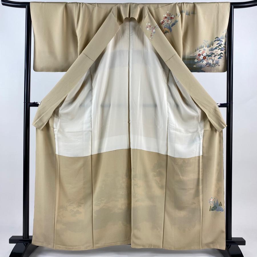 訪問着 身丈162cm 裄丈66cm M 袷 落款あり 風景 建物 金彩 ベージュ 正絹 秀品 中古
