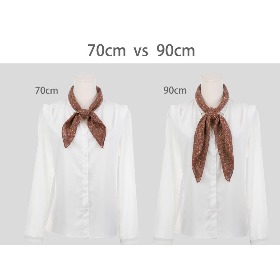 サイズ:スクエア/ロングシフォンネッカチーフは、70x70cm、90x90cm、140x5cm、180x5cmの4つのサイズがあります。写真は正方形スカーフ70cmと90cmの比較、ロングスカーフ140cmと180cmのサイズ比較です。ご注文前にサイズを選択してください。