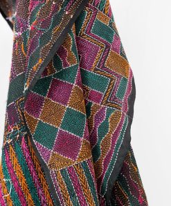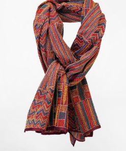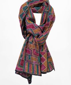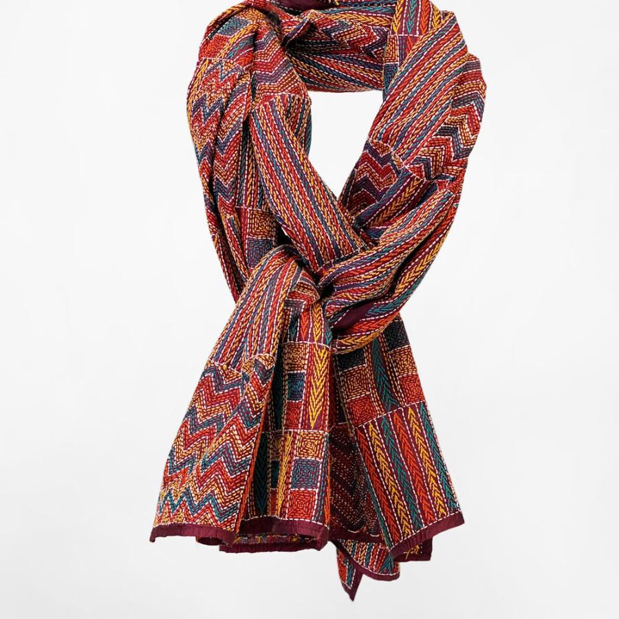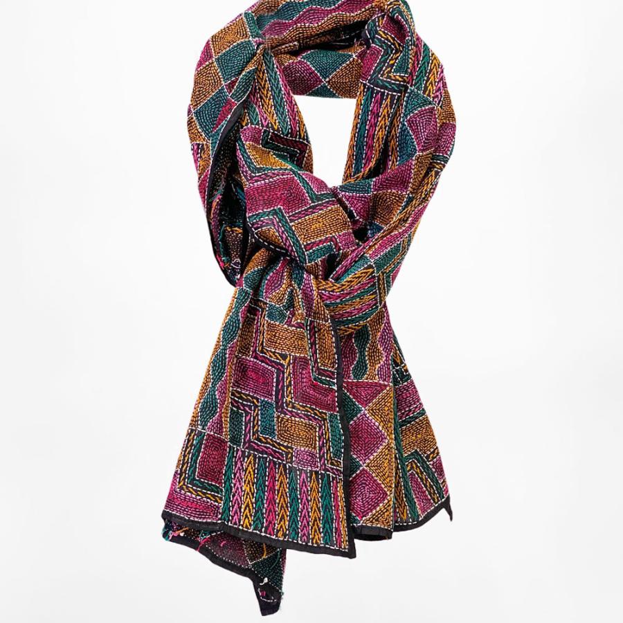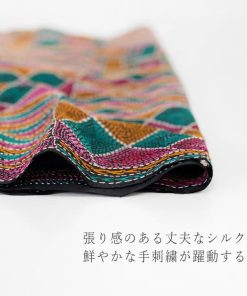 手織りのタッサーシルク生地に、刺し子風のカンタ刺繍を施しました。伝統的な図柄に加え、カラフルな色でシルクを染め、そこに幾何学模様などのモダンなデザインも取り入れ、アーティスティックな刺繍ストールを生み出しました。