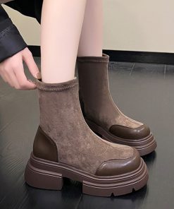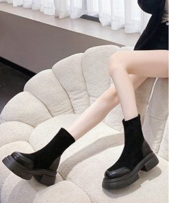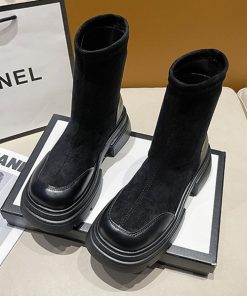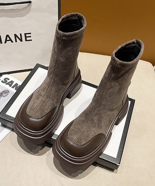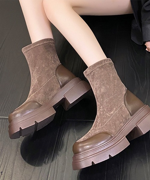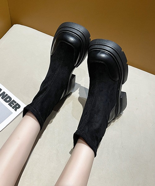 商品名:『Lilamusant(リラミュゾン)』フェイクスエード スクエアトゥ 厚底ストレッチショートブーツ ソックスブーツ プラットフォーム